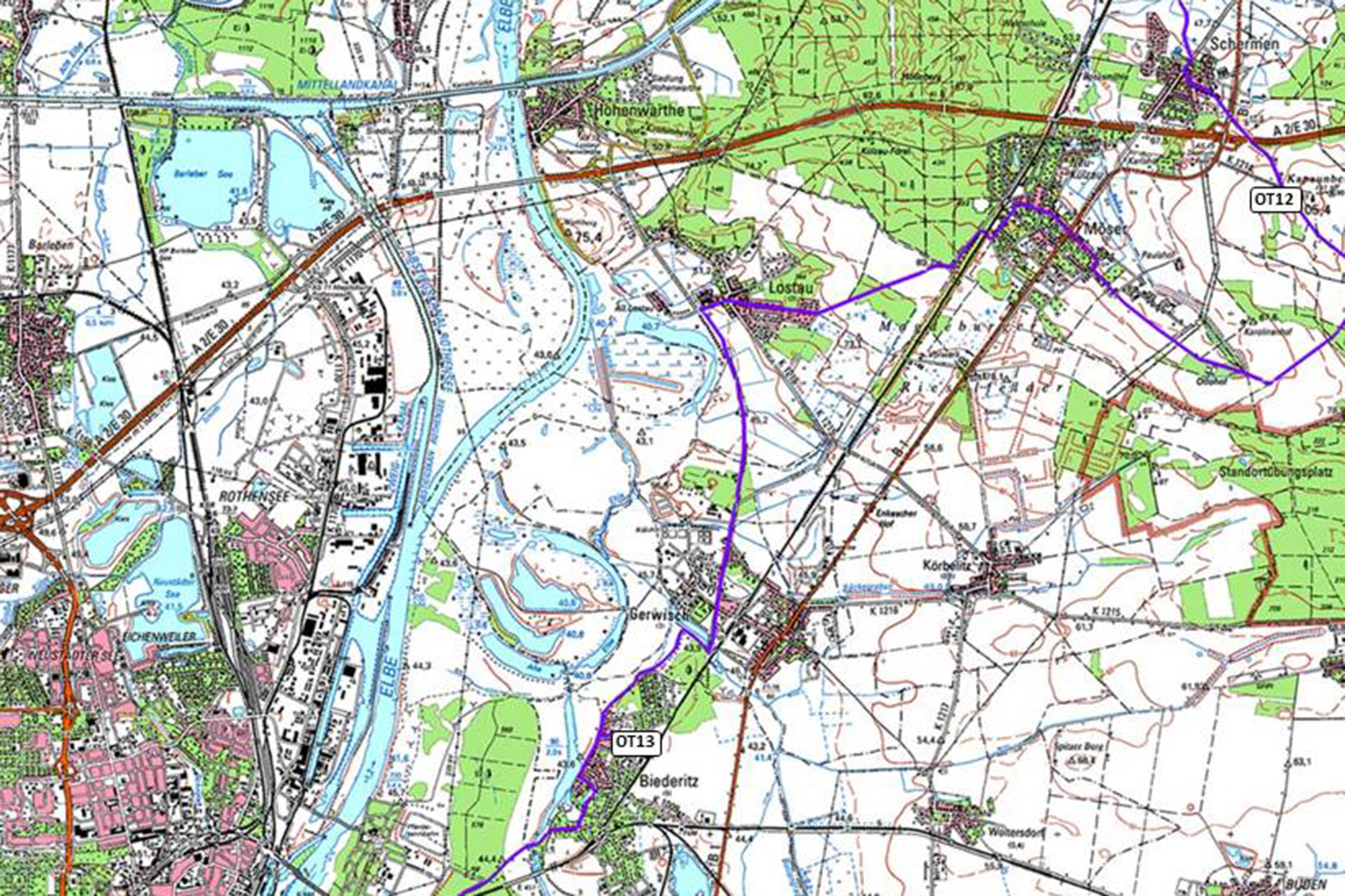 Telegraphenstraße: 13,4 km (Ritter, 2010): OT12 – K1214 – B1n – B1 (durch Möser und Gerwisch) – vor dem ersten Bahnübergang rechts nach Biederitz abbiegen, Woltersdorfer Str. ca. 1,5 km folgen, 50 m hinter Bahnübergang geradeaus (Hauptstr. biegt links ab!), danach weiter halblinks, nach ca. 200 m rechts einbiegen in die Breite Str., ca. 200 m folgen und rechts in die Lostauer Str. einbiegen, nach 300 m (am Telegrafen-Wegweiser) rechts in die Willi-Obermüller-Str. einbiegen, OT-Station 13 ca. 150 m (R. Ritter 12/2011).