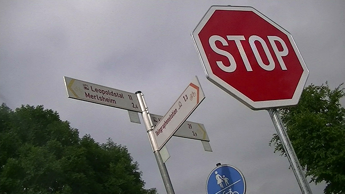 Beschilderung: standardisierte Stationstafel und standardisierter Wegweiser
