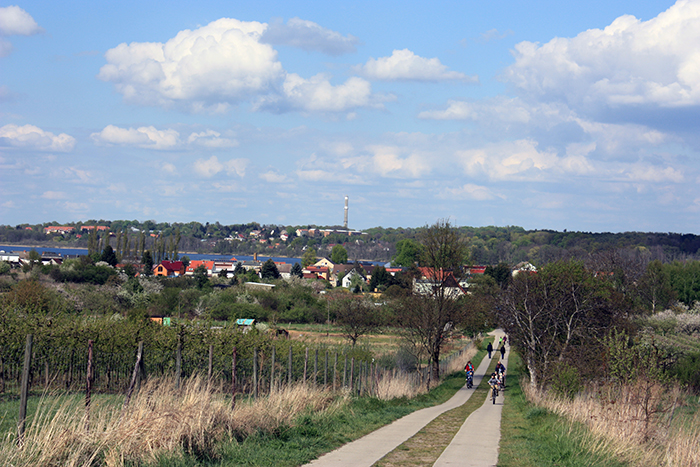 - Weiter zu Fuß geradeaus 350 m moderat aufwärts, nach r. noch 250 m auf dem „Panoramaweg Werderobst“ moderat bis steil aufwärts bis zur Station Nr. 5. Von dort großartiger Panoramablick, u. a. nach Werder und Potsdam mit dem Telegraphenberg (weitere Bilder zu Glindow und Werder bei der Station Nr. 5).